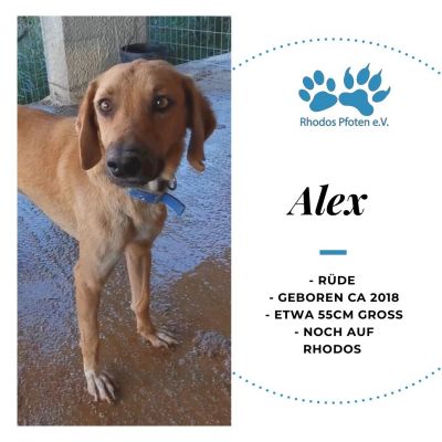 Unser hübscher Alex wurde alleine am Strand gefunden. Im Januar wurden wir von einer Frau kontaktiert, die uns bat, ihm zu helfen und ihn an seinem Aufenthaltsort wegzuholen. Zu diesem Zeitpunkt waren die Temperaturen auf Rhodos verhältnismäßig niedrig und der arme Kerl würde leiden. Wir schlugen der Frau eine Pension vor und dachten, sie sei bereit, ihn dorthin zu bringen. Offensichtlich haben wir falsch gedacht… Einige Tage später erfuhren wir nämlich, dass sie ihn zu unserem Tierarzt gebracht hatte, bei welchem der Hund einige Tage im Käfig verbrachte, damit er nicht wieder am Strand freigelassen würde. Zusammengefasst: die Frau tat überhaupt nichts, wir holten ihn letztendlich ab und brachten ihn in die Pension, in welcher er etwa zwei Monate verbrachte, da wir zu diesem Zeitpunkt kein freies Gehege hatten.