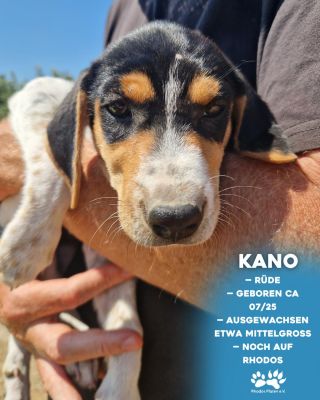 Kano zeigt sich bei Menschen etwas schüchterner als seine Geschwister. Im Kontakt mit Artgenossen ist er dagegen ein echter Draufgänger, der auch mit älteren Hunden spielt. Auch erkundet er recht selbstbewusst fremde Umgebungen.