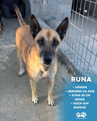 Typisch für ihre Rasse ist Runa sehr aufmerksam und hat im Zwinger stets alles im Blick, was um sie herum passiert. Sie läuft gut an der Leine und genießt gemeinsame Spaziergänge. Katzen, denen sie dabei begegnete, scheinen sie wenig zu interessieren.