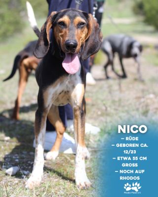 Mit Hündinnen sowie Rüden zeigt sich Nico sehr verträglich und spielt für sein Leben gern. An der Leine kann er bereits laufen, zieht dabei aktuell noch etwas stärker, was sich mit Übung aber sicher gut in den Griff bekommen lässt.
