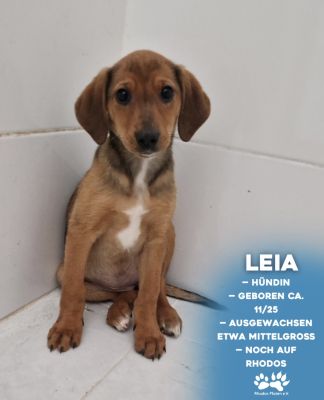 Leia wurde gemeinsam mit ihren Geschwistern ausgesetzt und ins Tierheim gebracht. Trotz dieses Starts ins Leben ist sie offen gegenüber Fremden und begegnet Menschen neugierig und freundlich.