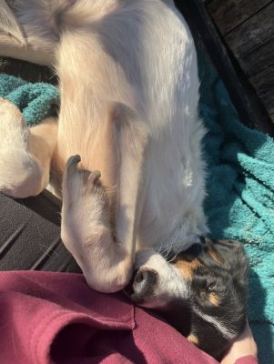 Mit Hündinnen versteht er sich prima, mit Rüden etwas weniger. Auch Katzen gegenüber zeigt er sich verträglich, beim Spazierengehen hat er sie bisher einfach ignoriert.