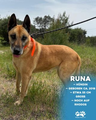 Typisch für ihre Rasse ist Runa sehr aufmerksam und hat im Zwinger stets alles im Blick, was um sie herum passiert. Sie läuft gut an der Leine und genießt gemeinsame Spaziergänge. Katzen, denen sie dabei begegnete, scheinen sie wenig zu interessieren.